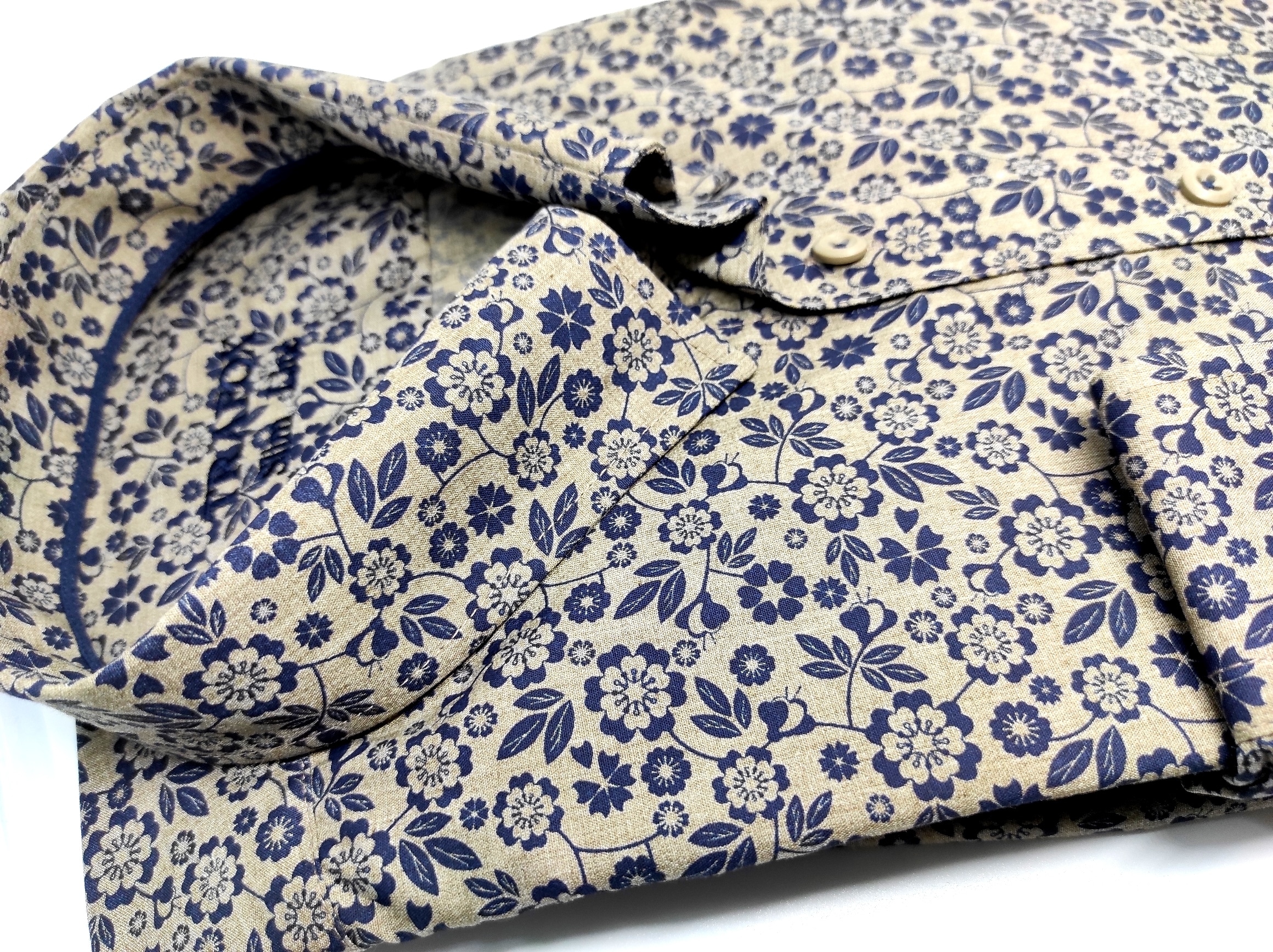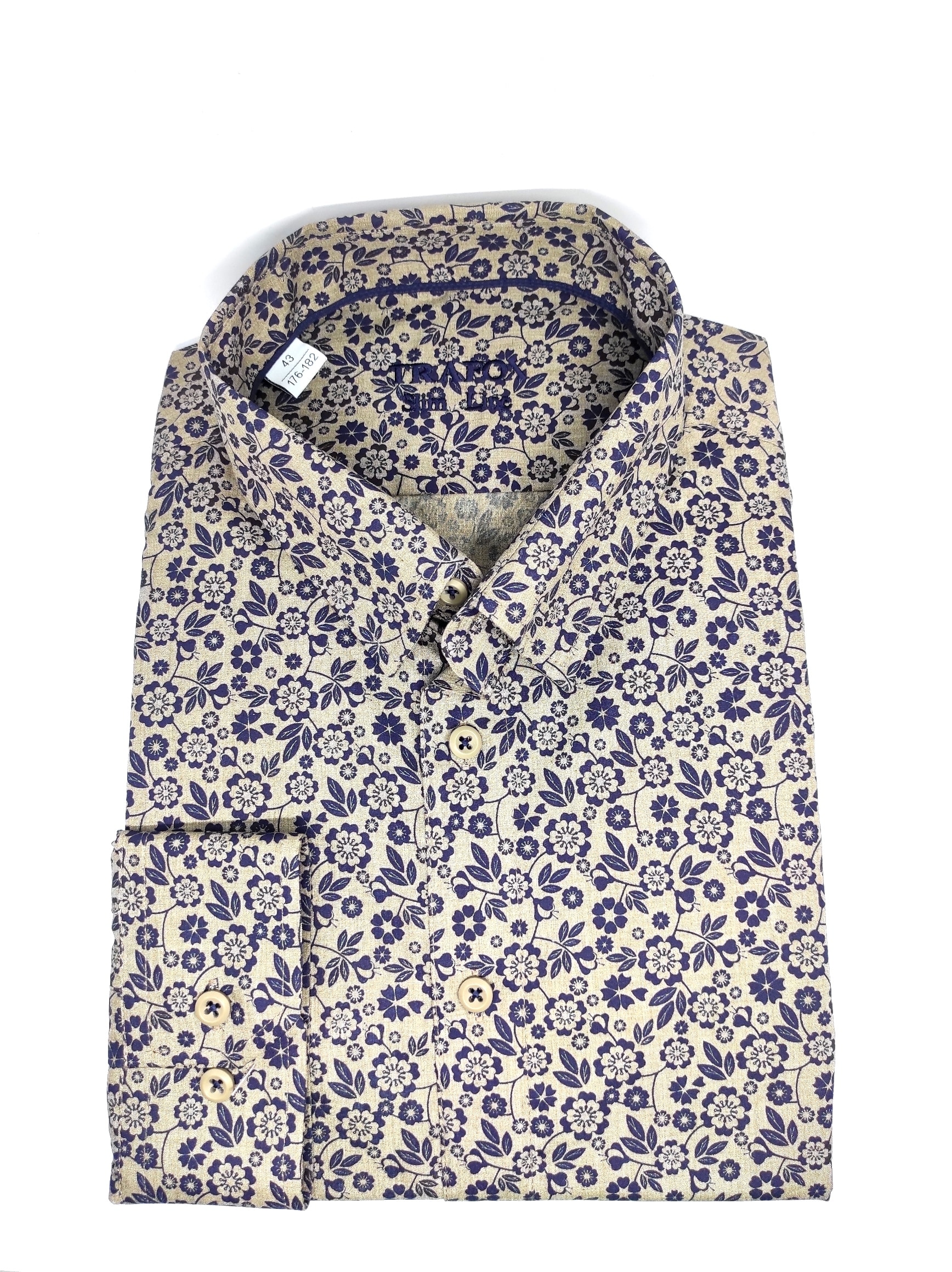 Koszula z najnowszej kolekcji firmy Trafox, brązowa w granatowe kwiatki.