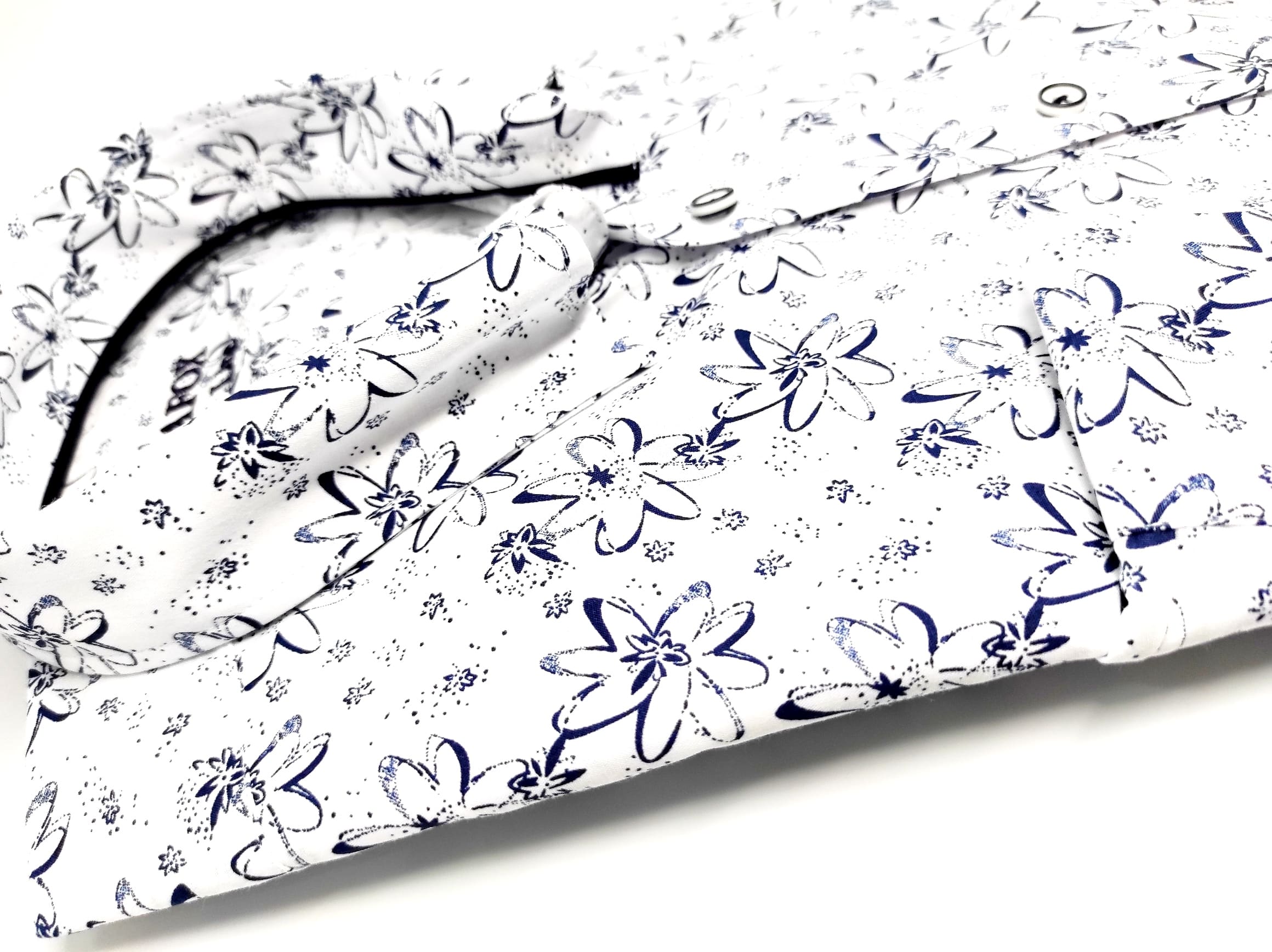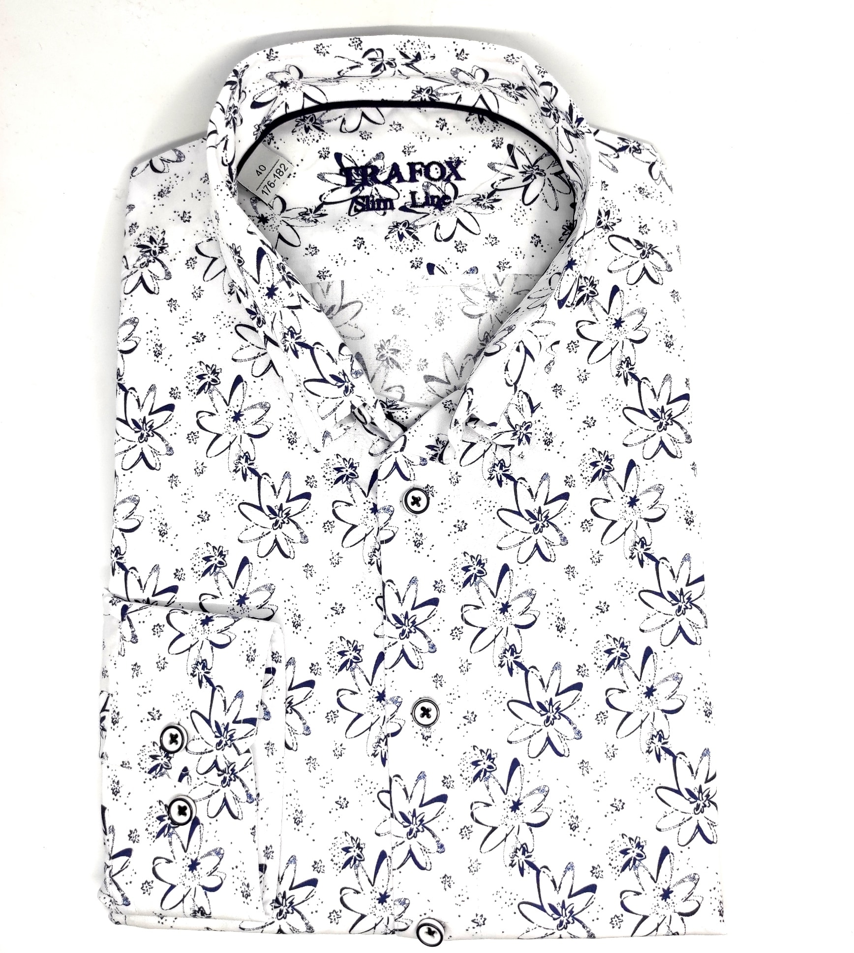 Koszula z najnowszej kolekcji firmy Trafox, biała w granatowe kwiatki.