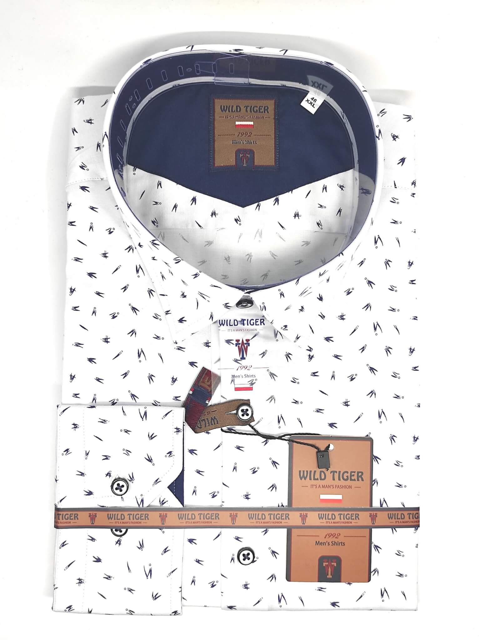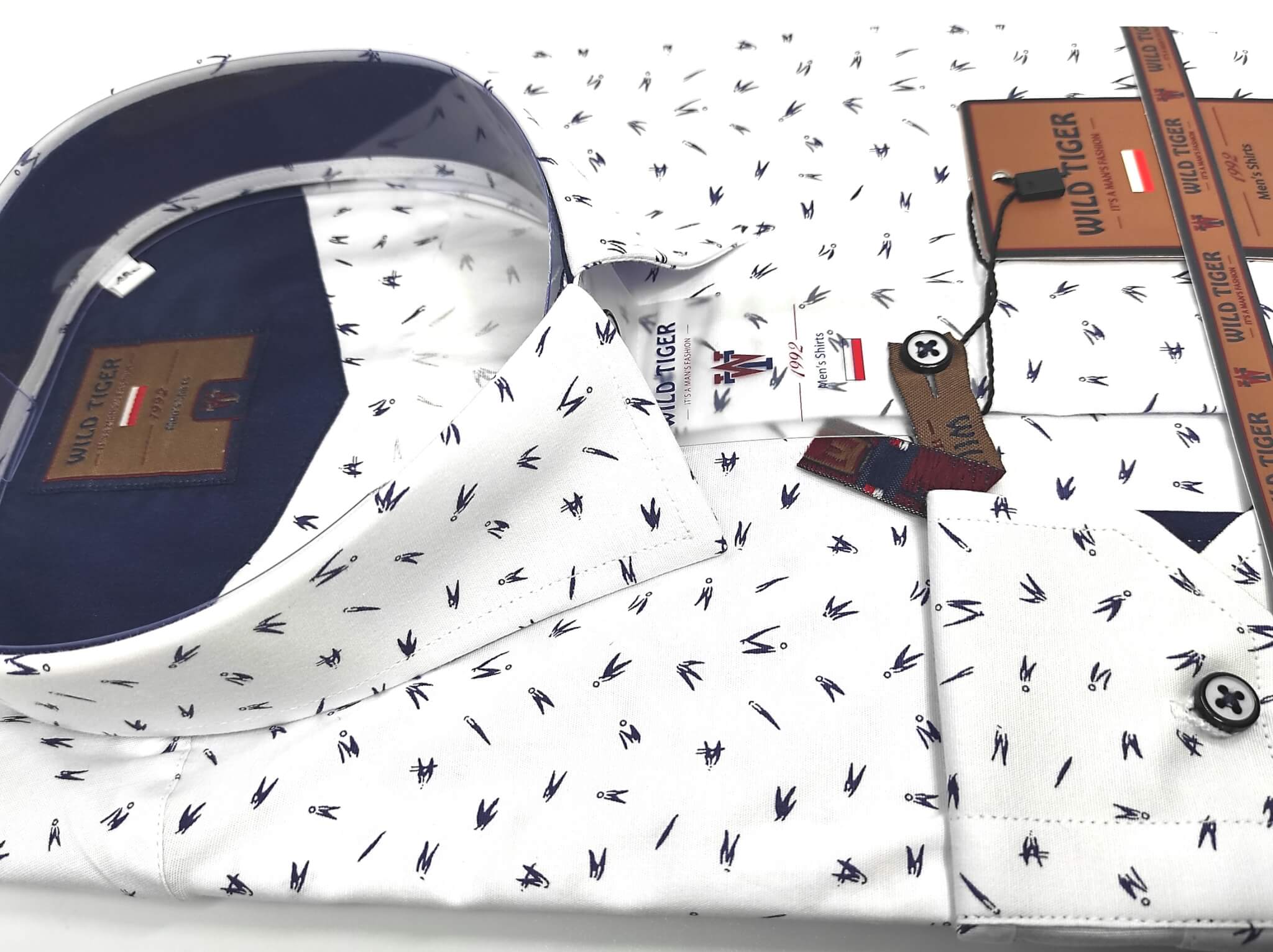 Koszula z najnowszej kolekcji firmy Wild Tiger, biała granat wzór.