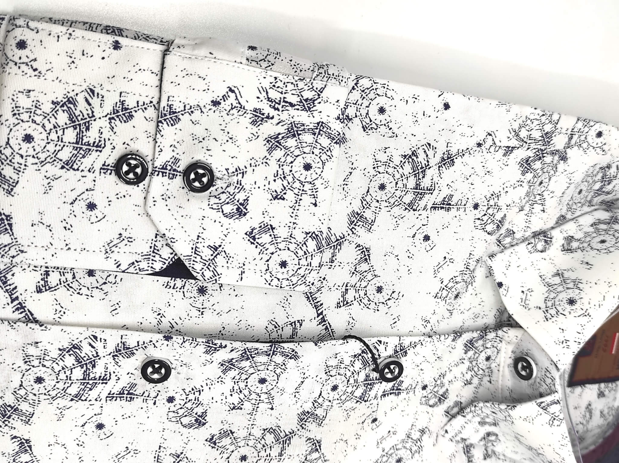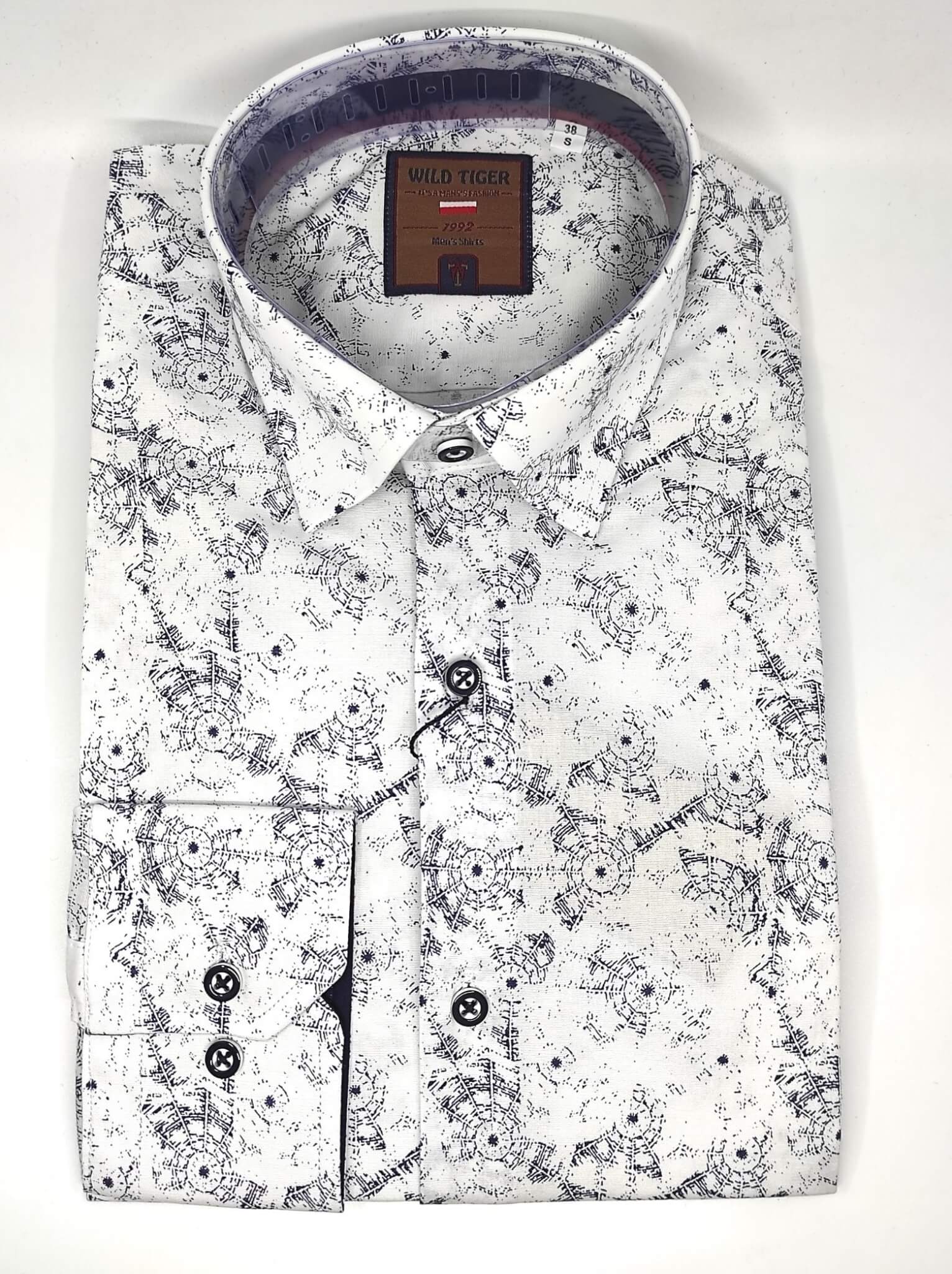 Koszula z najnowszej kolekcji firmy Wild Tiger, biała w granatowy wzór pajęczyna.