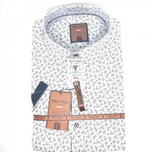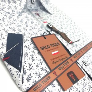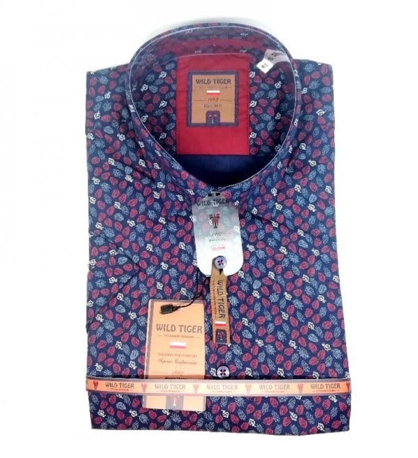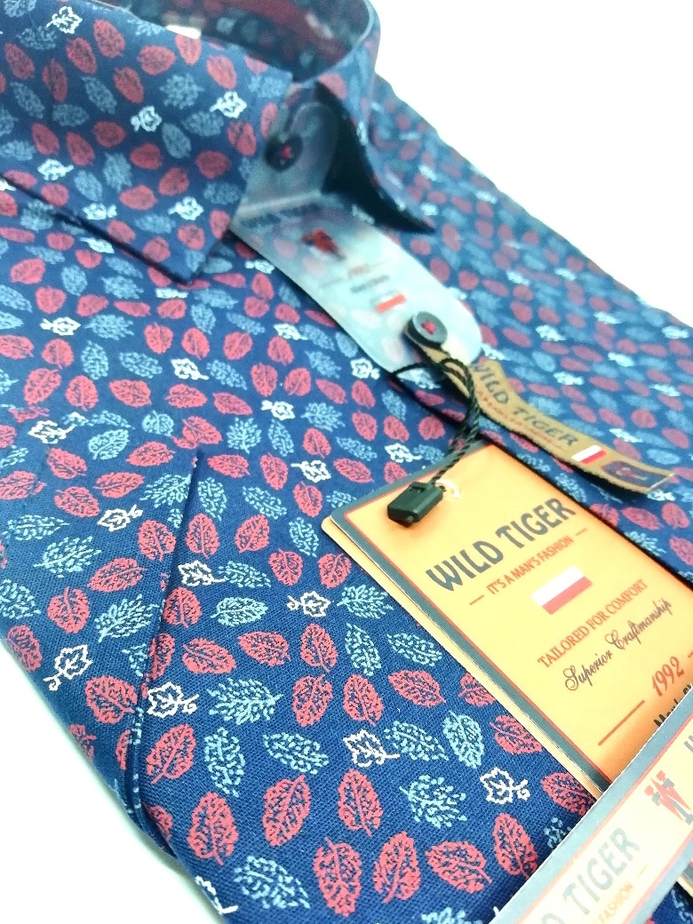 Koszula z najnowszej kolekcji firmy Wild Tiger, granatowa w białe, czerwone i granatowe liście – krótki rękaw.