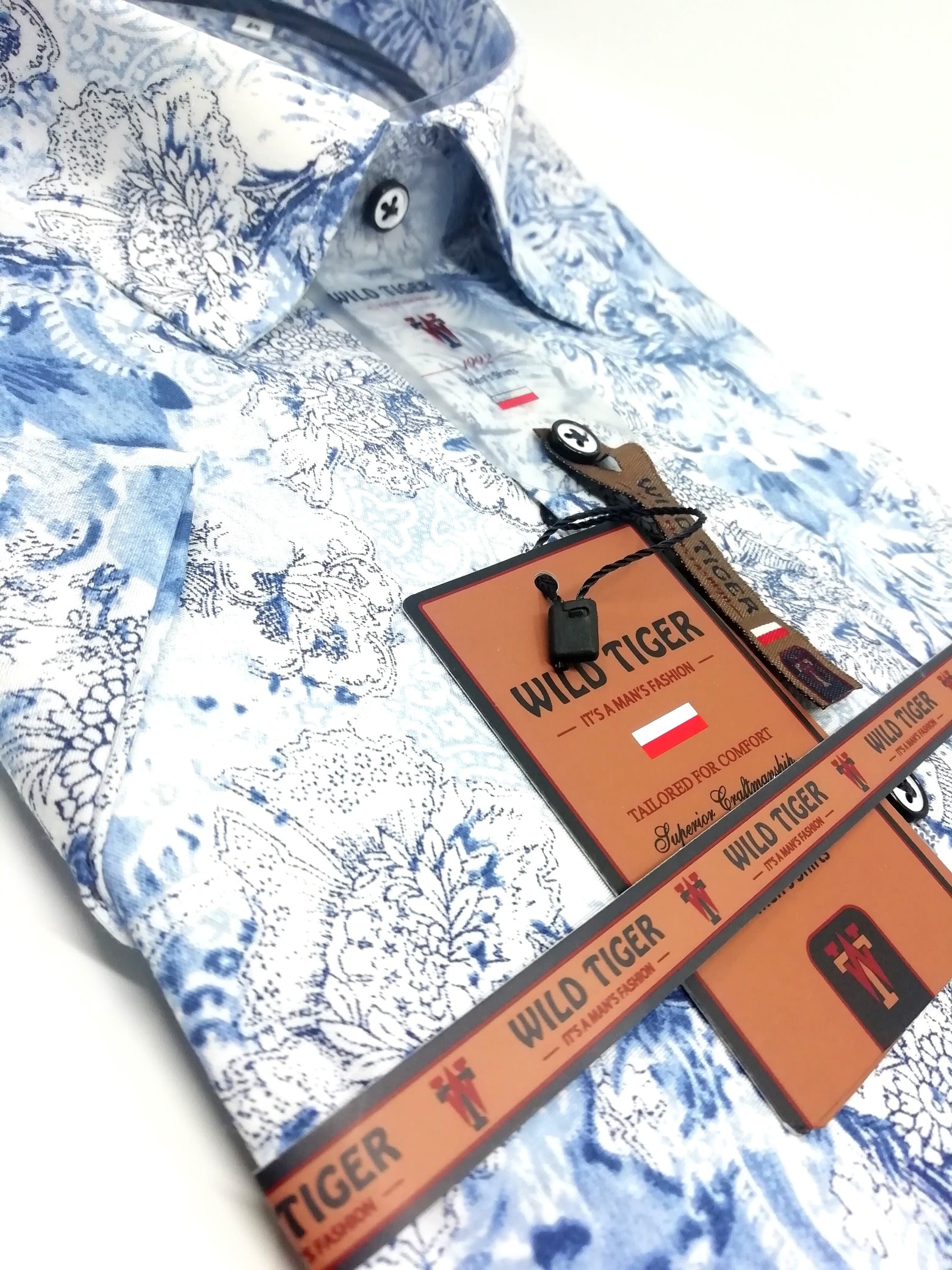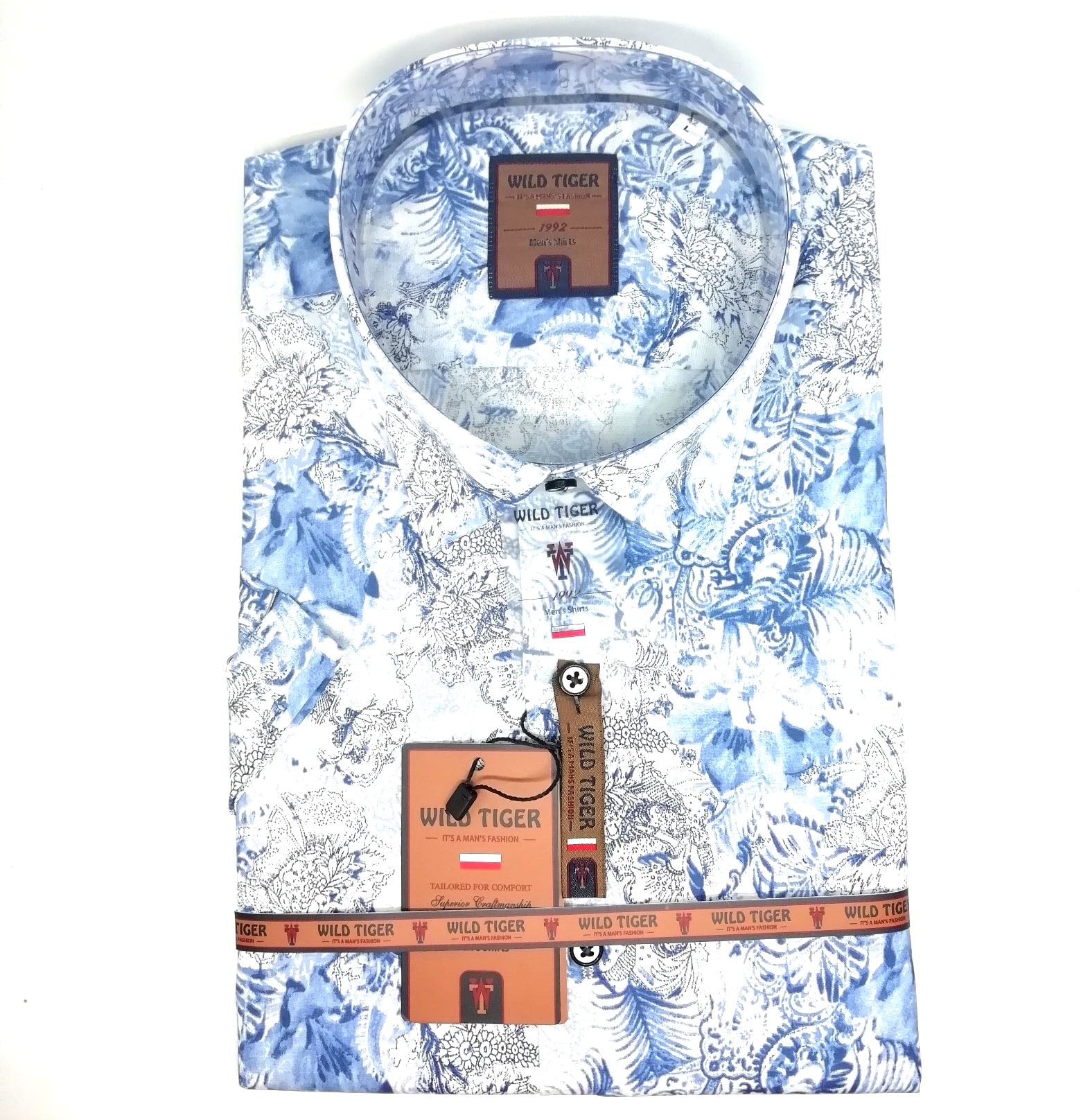 Koszula z najnowszej kolekcji firmy Wild Tiger, niebieska w kwiaty – krótki rękaw.