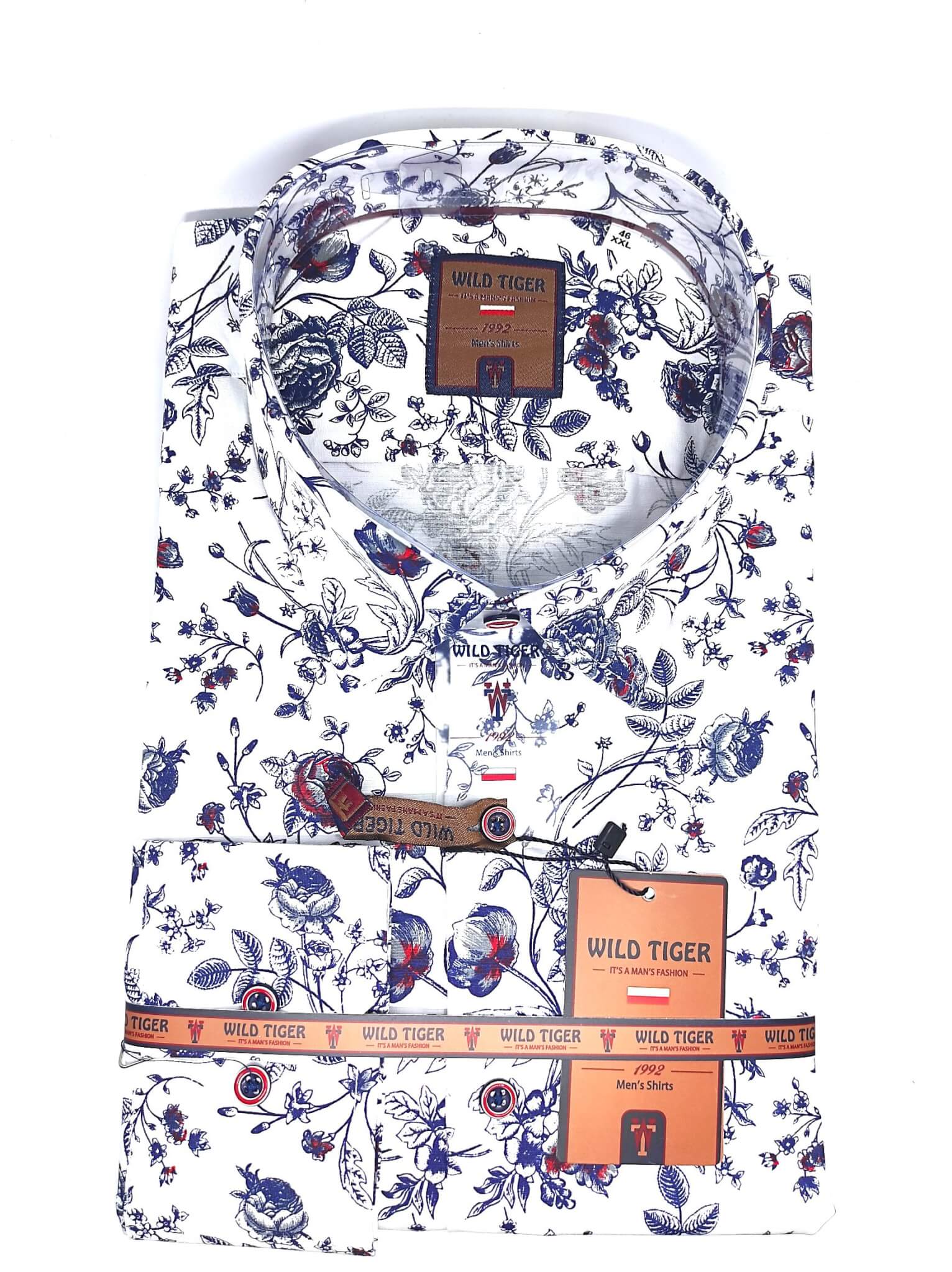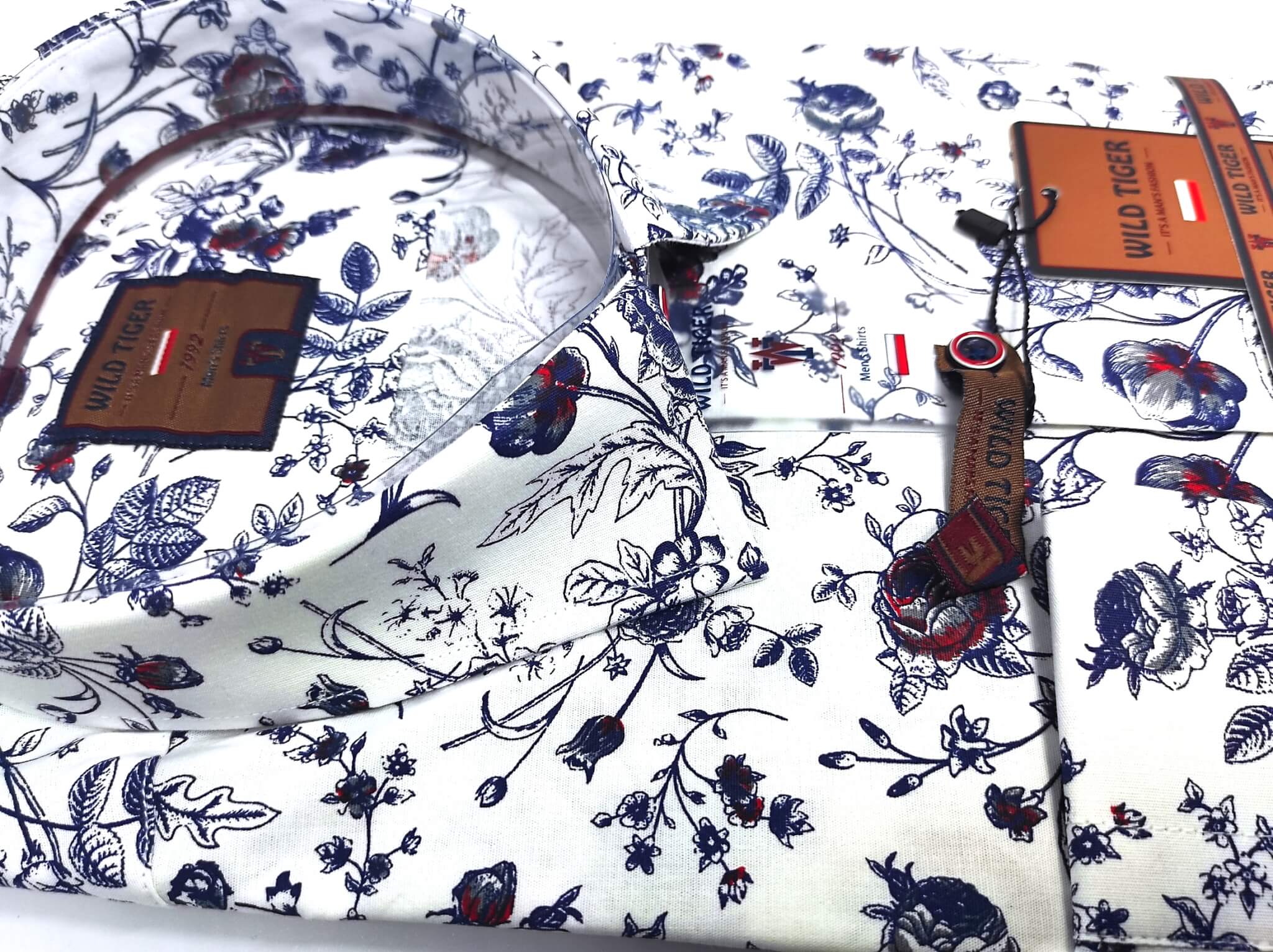 Koszula z najnowszej kolekcji firmy Wild Tiger, biała w róże bordo.