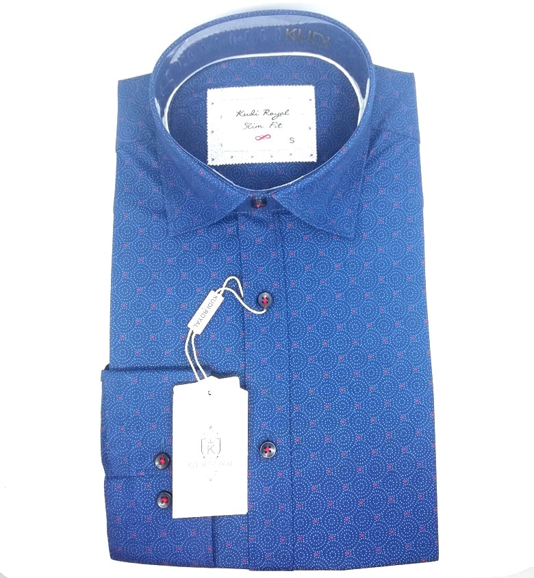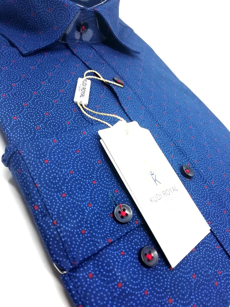 Koszula z najnowszej kolekcji firmy Kudi, granatowa w biało-czerwone kropki.