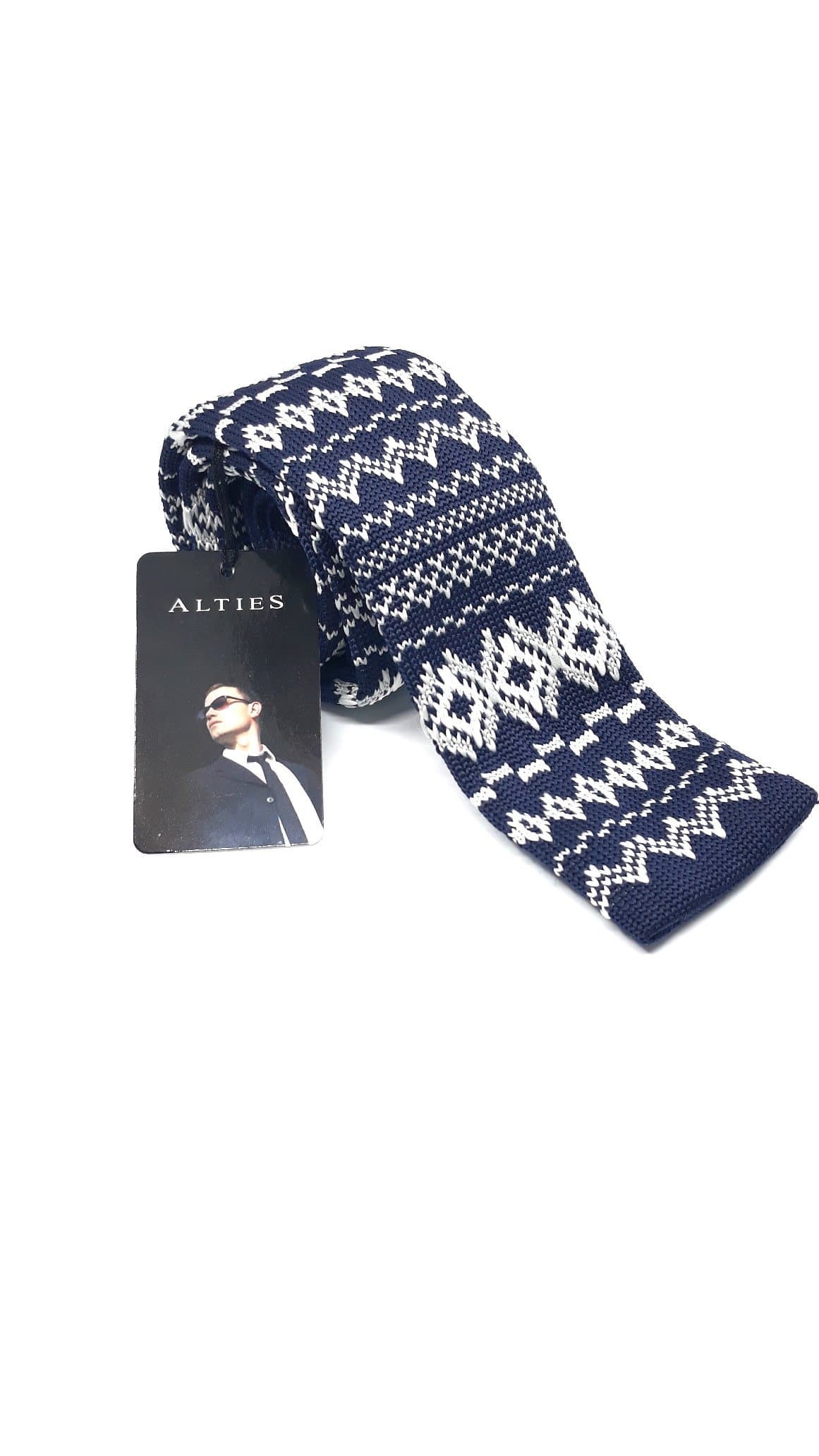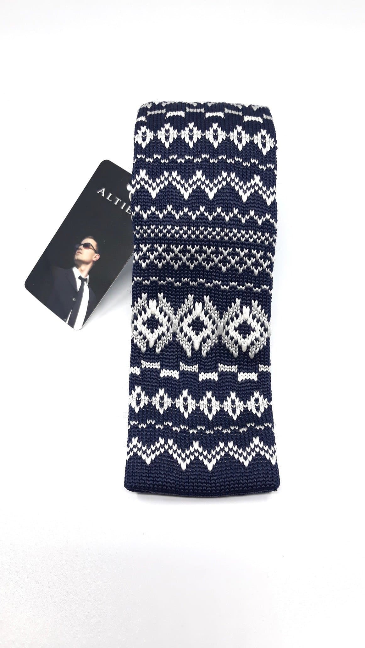 Dziergany krawat typu KNIT to najnowszy HIT ostatnich czasów, w ciekawy granatowo biało szary skandynawski wzór.