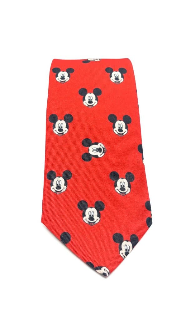 Elegancki krawat męski we wzór Myszki Miki na czerwonym tle.