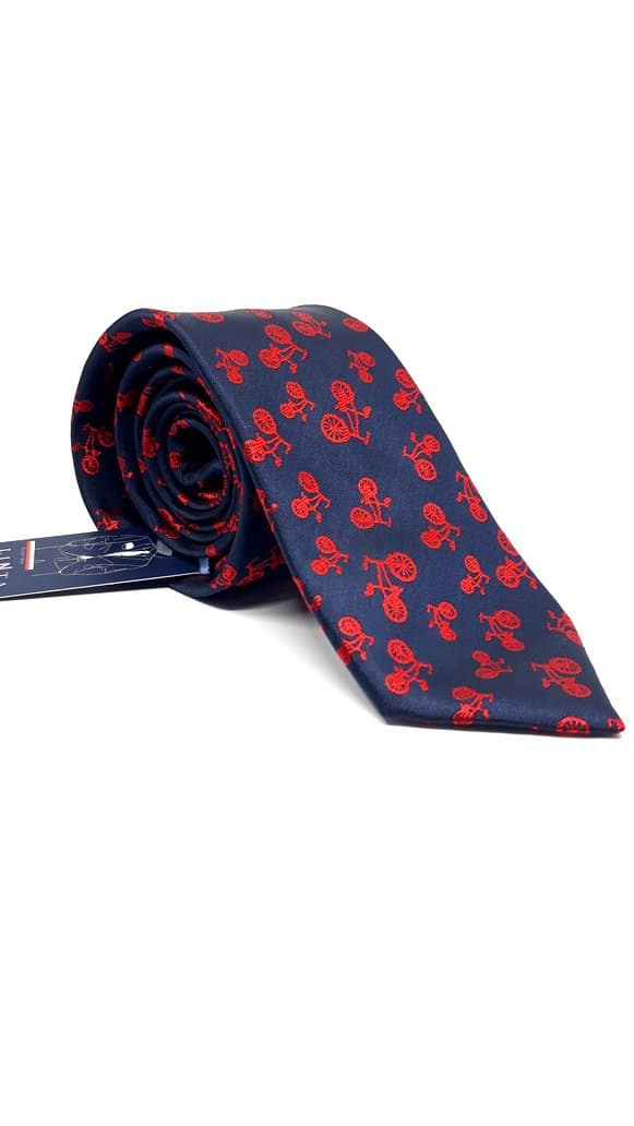 Elegancki krawat męski w ciekawy wzór rowerów na granatowym tle.