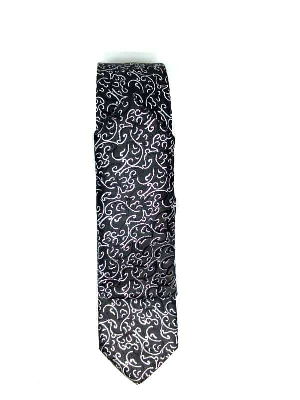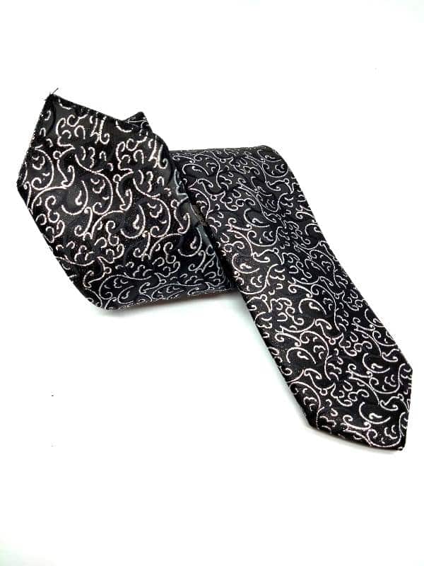 Elegancki krawat męski ślubny z poszetką – czarno biały. Krawat o klasycznym i modnym kroju, wykonany ze sztucznego jedwabiu. Jest on bardzo ważnym elementem ubioru, dzięki któremu każdy mężczyzna może wnieść do swojego stroju odrobinę koloru. Kompletując garderobę należy pamiętać, aby krawat tworzył spójny zestaw z marynarką lub koszulą. Jego unikatowy wzór z pewnością spełni swoją funkcję w połączeniu z różnymi tkaninami w kilku wariantach kolorystycznych. Ponadto wyraźne i mocne akcenty zdobnicze dodadzą charakteru i pozwolą wyróżnić się stylem. Krawat można dobrać zarówno do karnacji, garnituru jak i temperamentu.