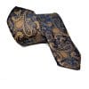 Elegancki krawat męski ślubny z poszetką – granat i stare złoto. Krawat o klasycznym i modnym kroju, wykonany ze sztucznego jedwabiu. Jest on bardzo ważnym elementem ubioru, dzięki któremu każdy mężczyzna może wnieść do swojego stroju odrobinę koloru. Kompletując garderobę należy pamiętać, aby krawat tworzył spójny zestaw z marynarką lub koszulą. Jego unikatowy wzór z pewnością spełni swoją funkcję w połączeniu z różnymi tkaninami w kilku wariantach kolorystycznych. Ponadto wyraźne i mocne akcenty zdobnicze dodadzą charakteru i pozwolą wyróżnić się stylem. Krawat można dobrać zarówno do karnacji, garnituru jak i temperamentu.