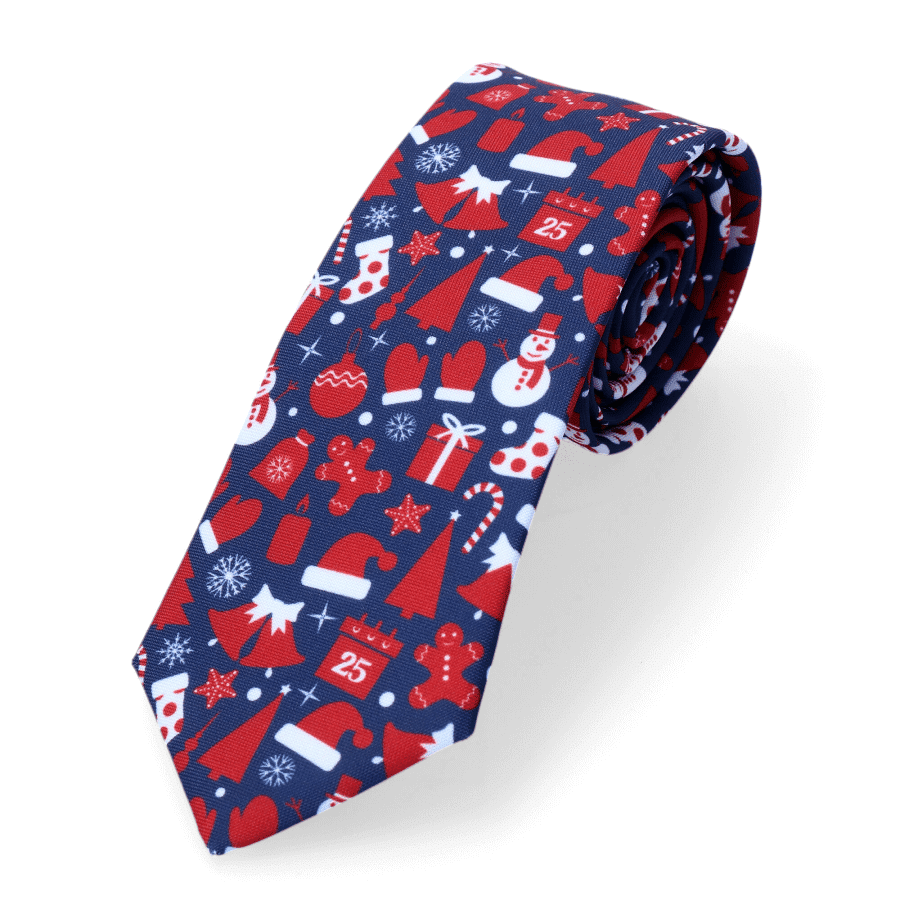 Świąteczny elegancki krawat męski w ciekawy wzór bałwanów prezentów, czapek i wielu inny świątecznych symboli.