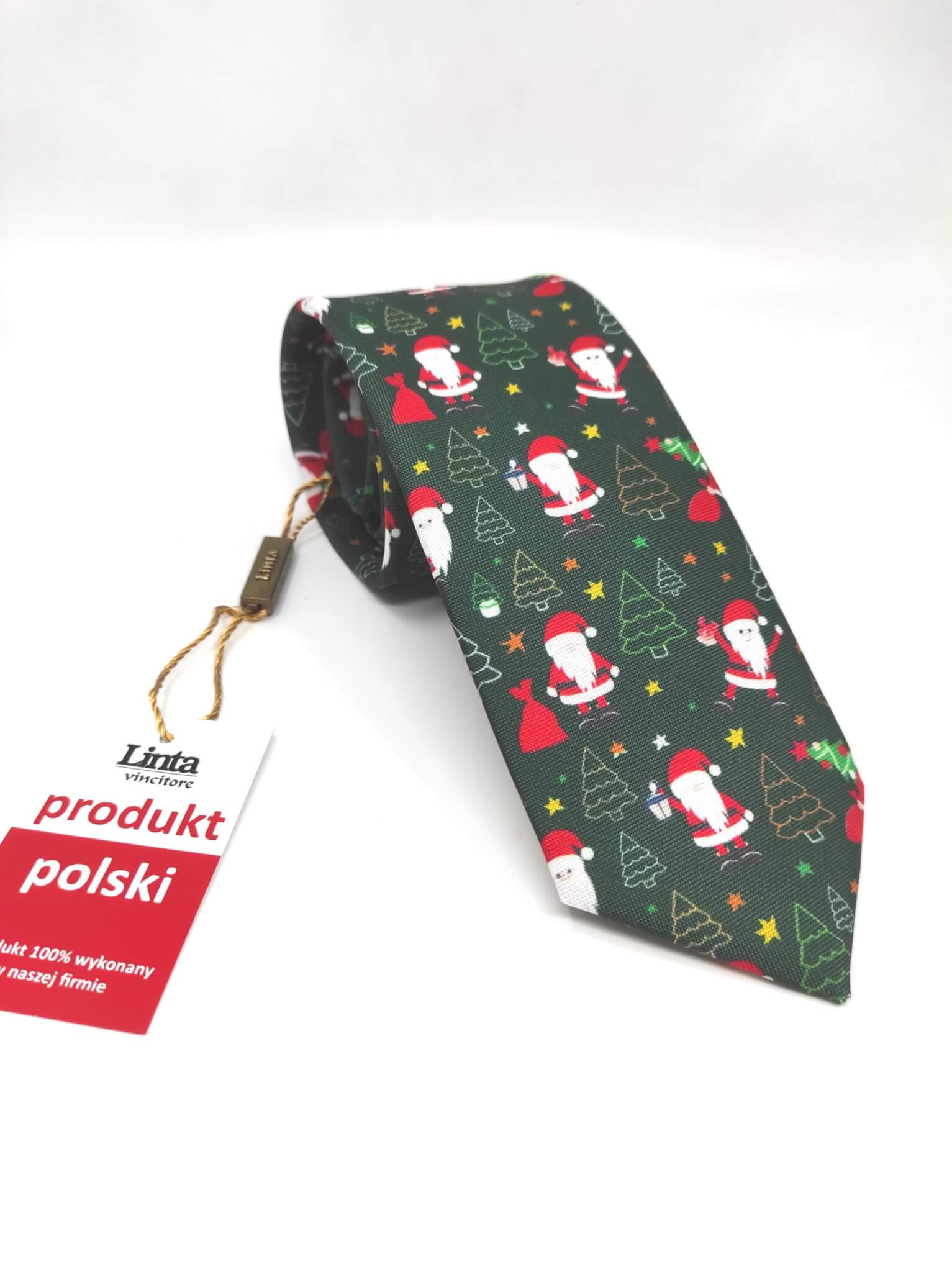 Świąteczny elegancki krawat męski w ciekawy wzór Mikołajów oraz Choinek.