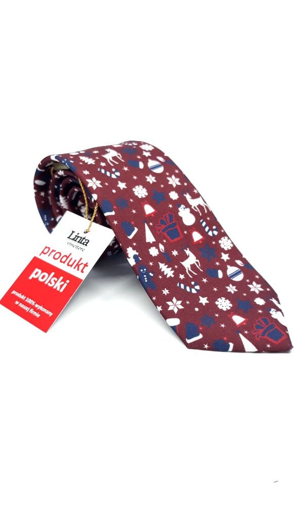 Świąteczny elegancki krawat męski w ciekawy wzór reniferów, choinek, czapek i wielu inny świątecznych symboli.