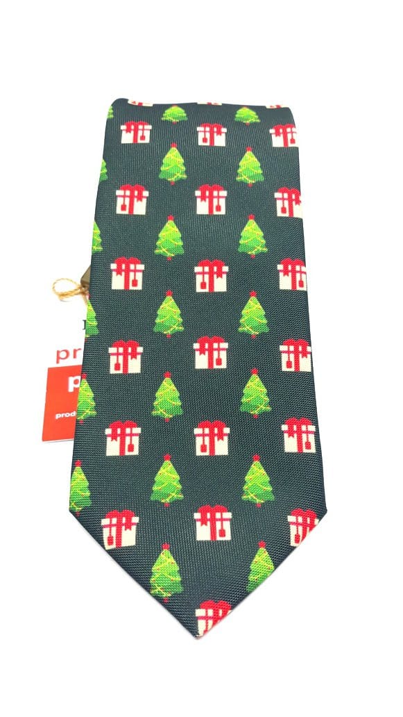 Świąteczny elegancki krawat męski w ciekawy wzór choinek oraz prezentów na zielonym tle.