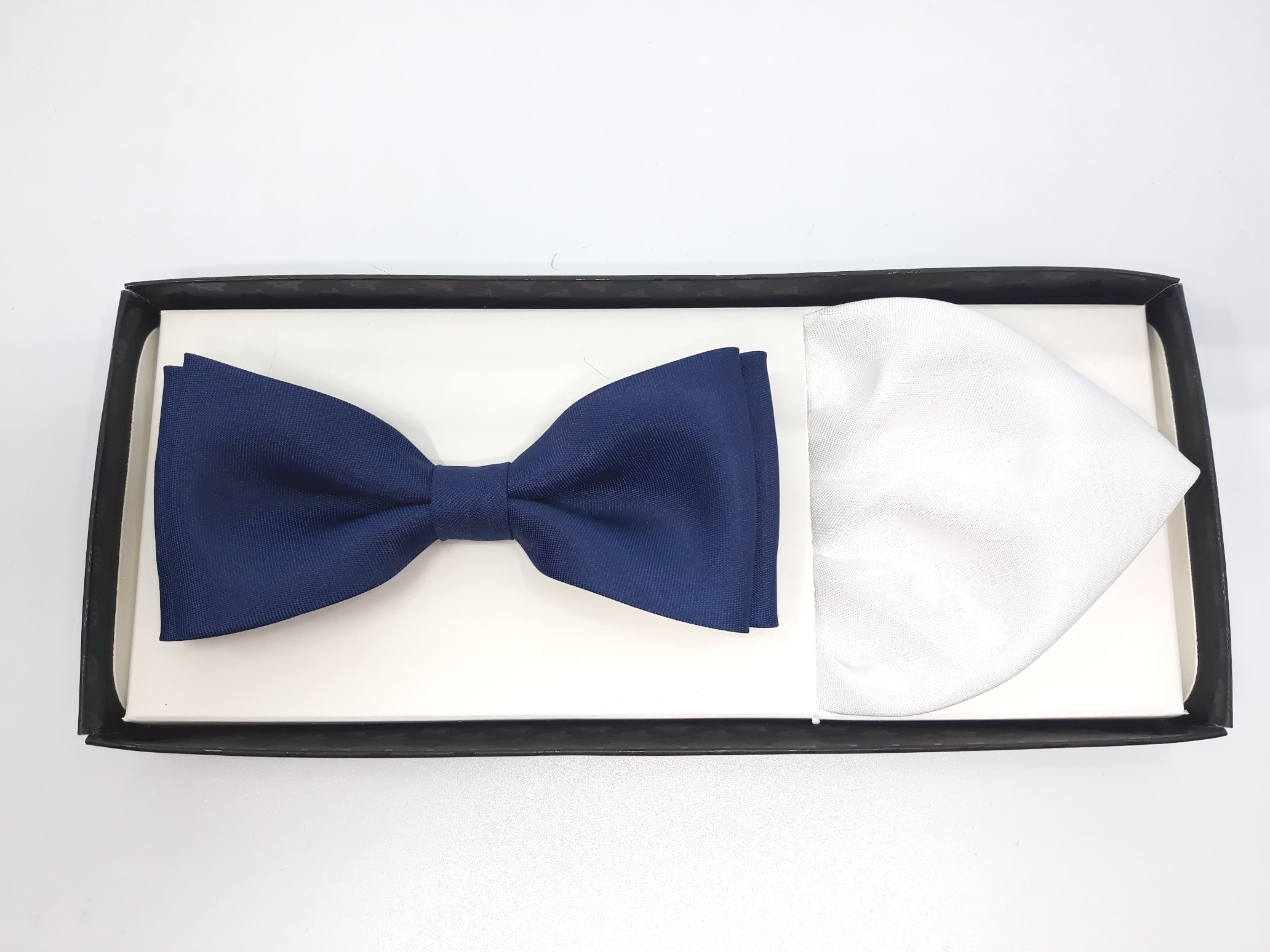 Unikatowa mucha w zestawie z poszetką w kolorze granatowym.