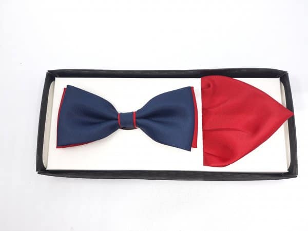 Unikatowa mucha w zestawie z poszetką w kolorze granatow0-czerwonym.