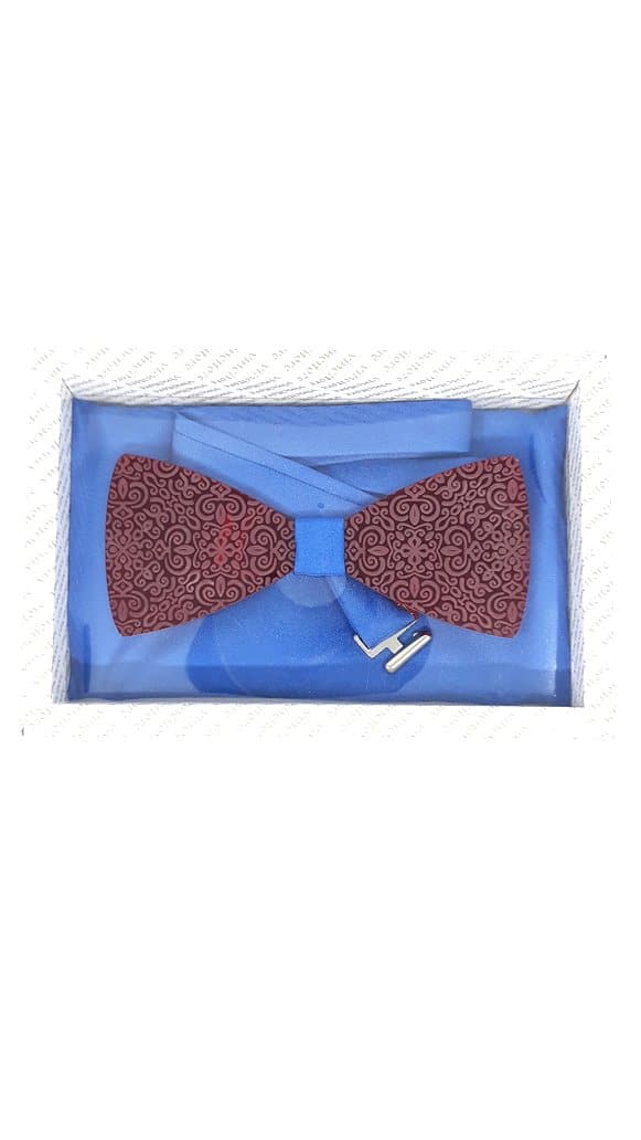 Unikatowa mucha męska plastikowa, bordowa ze wzorkami wraz z niebieską poszetką.