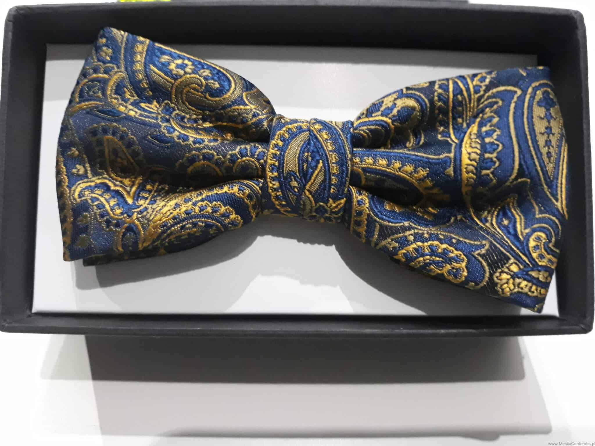 Elegancka mucha w zestawie z poszetką , granatowa w żółty wzór. Mucha to dodatek, który stanowi bazę garderoby eleganckiego mężczyzny. Zgodnie z płynącym obecnie trendy modowym nie ma obowiązku, który mówiłby o łączeniu jej z frakiem czy kołnierzykiem łamanym przy koszuli. Moda nowoczesna zestawia muchę nie tylko ze stylem eleganckim, ale również z luźnym i sportowym strojem. Niebanalna mucha orzeźwi tradycyjny garnitur, jak również wyśmienicie będzie się komponować ze sportową marynarką czy luźnym kardiganem.