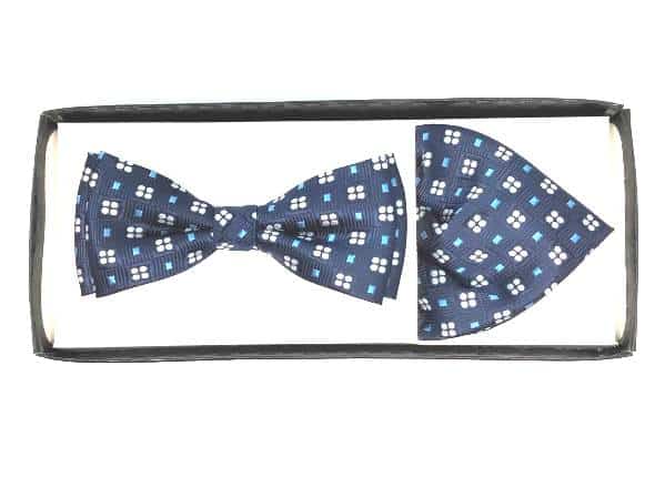 Unikatowa mucha w zestawie z poszetką, granatowa w biało niebieski wzorek.