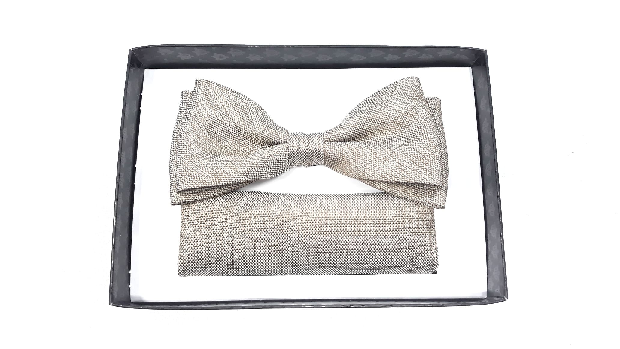 Elegancka mucha w zestawie z poszetką biszkoptowa. Mucha to dodatek, który stanowi bazę garderoby eleganckiego mężczyzny. Zgodnie z płynącym obecnie trendy modowym nie ma obowiązku, który mówiłby o łączenia jej z frakiem czy kołnierzykiem łamanym przy koszuli. Moda nowoczesna zestawia muchę nie tylko ze stylem eleganckim, ale również z luźnym i sportowym strojem. Niebanalna mucha orzeźwi tradycyjny garnitur, jak również wyśmienicie będzie się komponować ze sportową marynarką czy luźnym kardiganem.