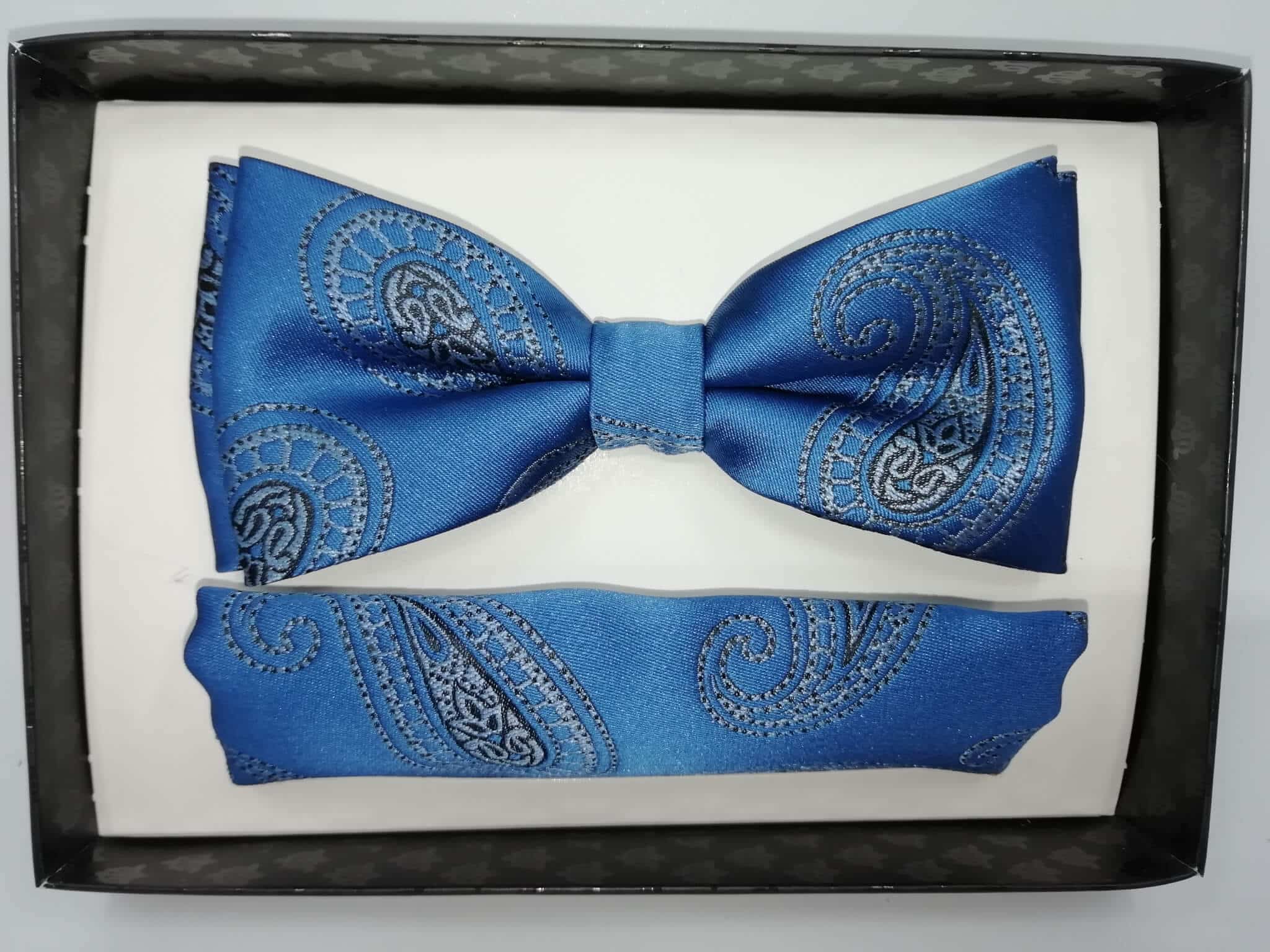 Elegancka mucha w zestawie z poszetką , niebiesko szara w turecki wzór. Mucha to dodatek, który stanowi bazę garderoby eleganckiego mężczyzny. Zgodnie z płynącym obecnie trendy modowym nie ma obowiązku, który mówiłby o łączeniu jej z frakiem czy kołnierzykiem łamanym przy koszuli. Moda nowoczesna zestawia muchę nie tylko ze stylem eleganckim, ale również z luźnym i sportowym strojem. Niebanalna mucha orzeźwi tradycyjny garnitur, jak również wyśmienicie będzie się komponować ze sportową marynarką czy luźnym kardiganem.