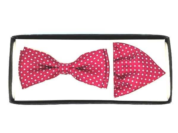 Unikatowa mucha w zestawie z poszetką, bordowa w biały wzorek.
