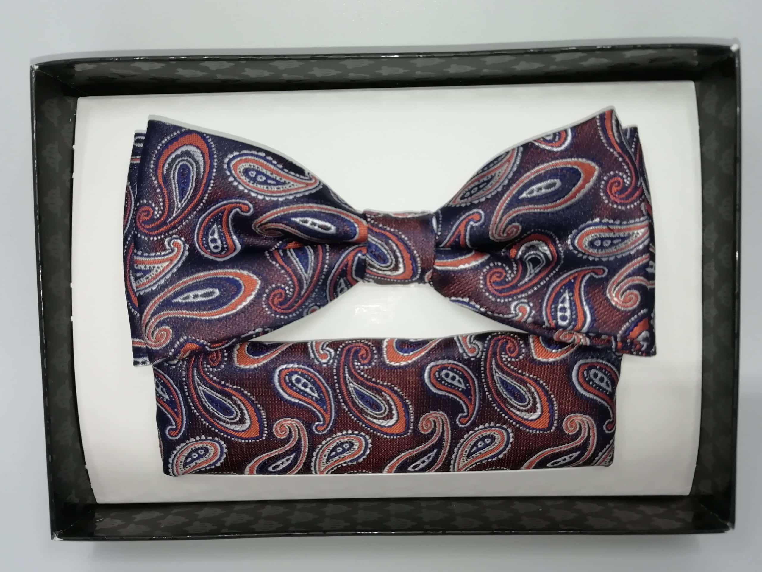 Elegancka mucha w zestawie z poszetką, brązowo-bordowa w turecki wzór. Mucha to dodatek, który stanowi bazę garderoby eleganckiego mężczyzny. Zgodnie z płynącym obecnie trendy modowym nie ma obowiązku, który mówiłby o łączenia jej z frakiem czy kołnierzykiem łamanym przy koszuli. Moda nowoczesna zestawia muchę nie tylko ze stylem eleganckim, ale również z luźnym i sportowym strojem. Niebanalna mucha orzeźwi tradycyjny garnitur, jak również wyśmienicie będzie się komponować ze sportową marynarką czy luźnym kardiganem.