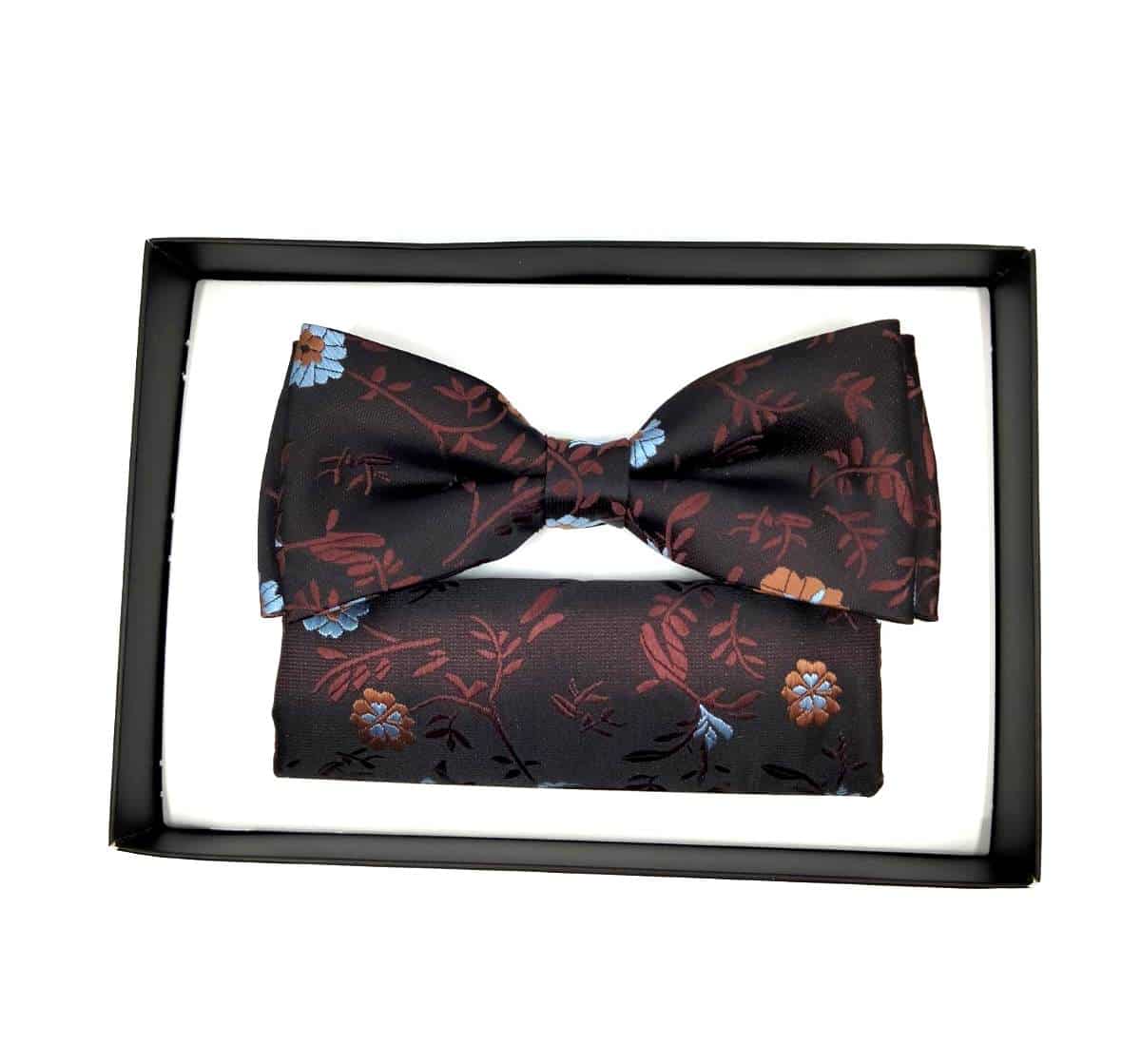 Unikatowa mucha w zestawie z poszetką brązowa w białe kwiatki.