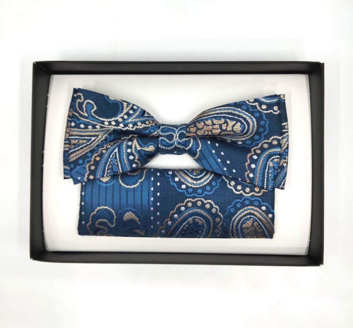 Unikatowa mucha w zestawie z poszetką niebieska w brązowo białe wzory.