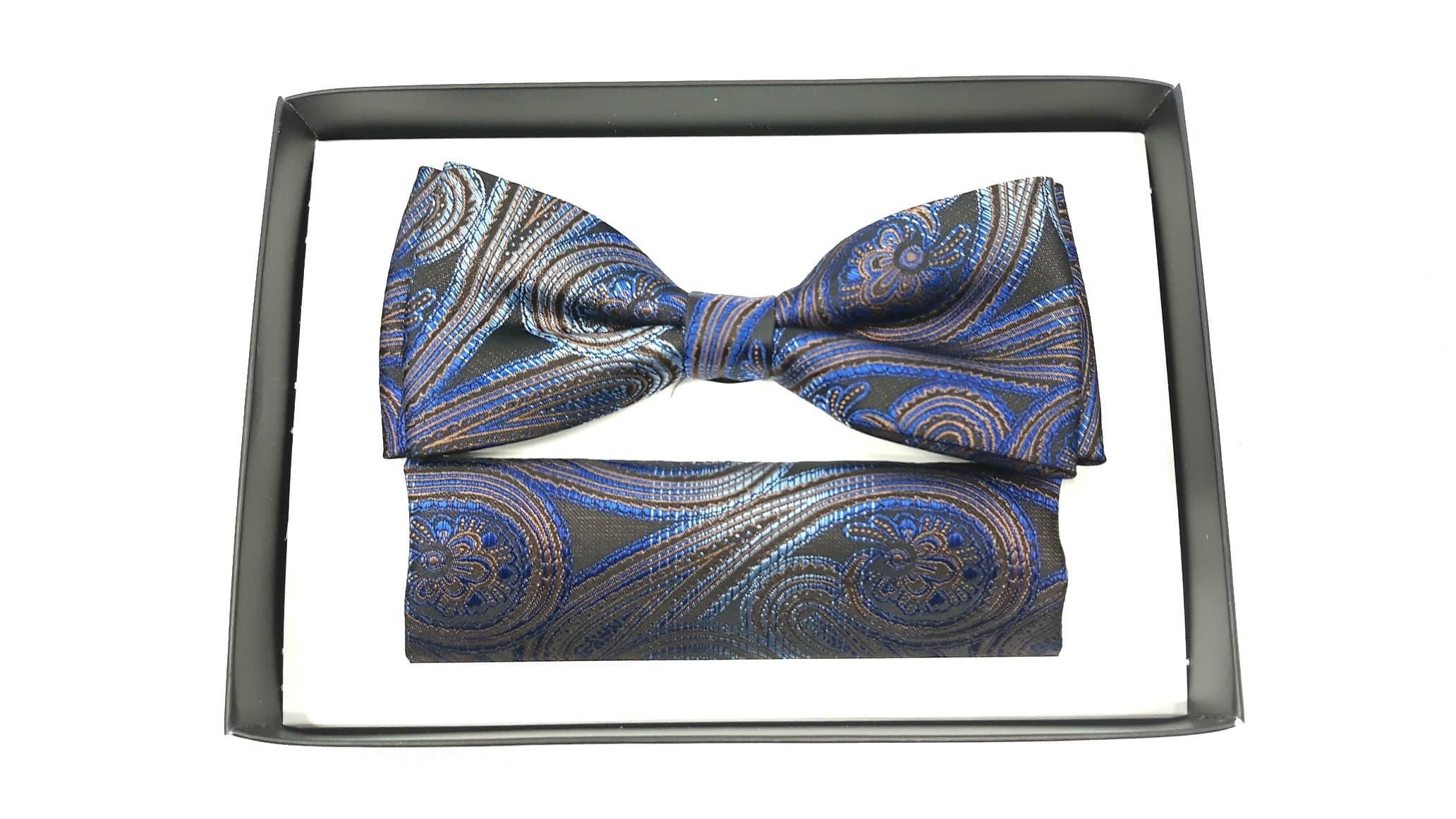 Elegancka mucha w zestawie z poszetką, brązowo niebieska z dodatkiem złota we wzorze. Mucha to dodatek, który stanowi bazę garderoby eleganckiego mężczyzny. Zgodnie z płynącym obecnie trendy modowym nie ma obowiązku, który mówiłby o łączenia jej z frakiem czy kołnierzykiem łamanym przy koszuli. Moda nowoczesna zestawia muchę nie tylko ze stylem eleganckim, ale również z luźnym i sportowym strojem. Niebanalna mucha orzeźwi tradycyjny garnitur, jak również wyśmienicie będzie się komponować ze sportową marynarką czy luźnym kardiganem.