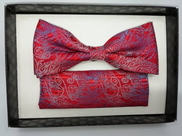 Unikatowa mucha w zestawie z poszetką, cieniowana w kolorze czerwonym z ciekawym wzorem.