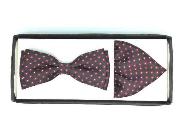 Unikatowa mucha w zestawie z poszetką, czarna w czerwony wzorek.