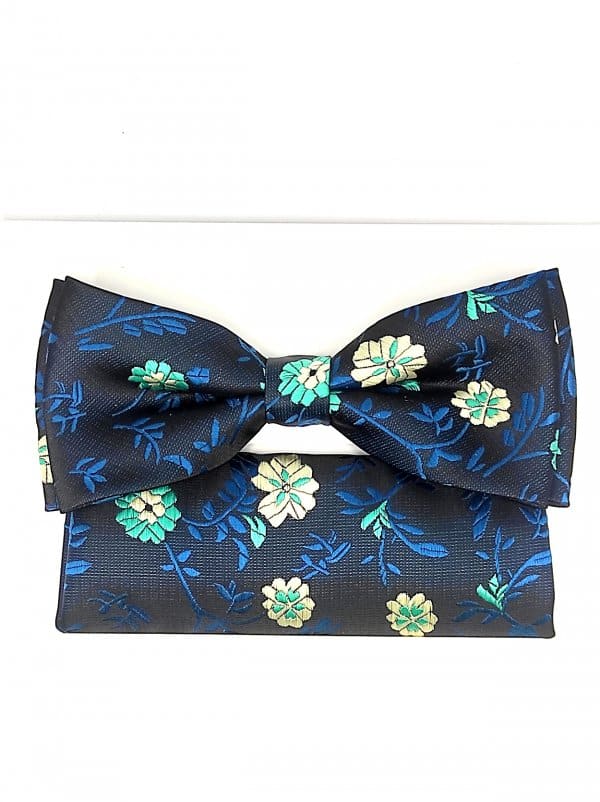 Unikatowa mucha w zestawie z poszetką czarna w beżowo morskie kwiatki.