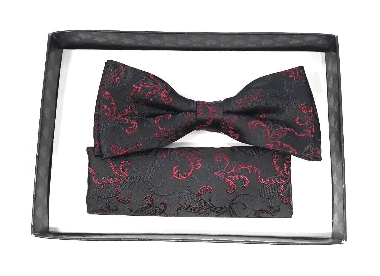 Elegancka mucha w zestawie z poszetką, czarna o unikatowym bordowym wzorze. Mucha to dodatek, który stanowi bazę garderoby eleganckiego mężczyzny. Zgodnie z płynącym obecnie trendy modowym nie ma obowiązku, który mówiłby o łączenia jej z frakiem czy kołnierzykiem łamanym przy koszuli. Moda nowoczesna zestawia muchę nie tylko ze stylem eleganckim, ale również z luźnym i sportowym strojem. Niebanalna mucha orzeźwi tradycyjny garnitur, jak również wyśmienicie będzie się komponować ze sportową marynarką czy luźnym kardiganem.