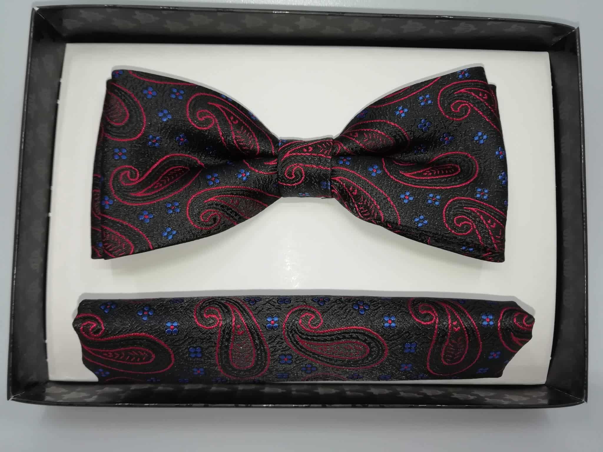 Elegancka mucha w zestawie z poszetką, czarno czerwona ze wzorem. Mucha to dodatek, który stanowi bazę garderoby eleganckiego mężczyzny. Zgodnie z płynącym obecnie trendy modowym nie ma obowiązku, który mówiłby o łączenia jej z frakiem czy kołnierzykiem łamanym przy koszuli. Moda nowoczesna zestawia muchę nie tylko ze stylem eleganckim, ale również z luźnym i sportowym strojem. Niebanalna mucha orzeźwi tradycyjny garnitur, jak również wyśmienicie będzie się komponować ze sportową marynarką czy luźnym kardiganem.