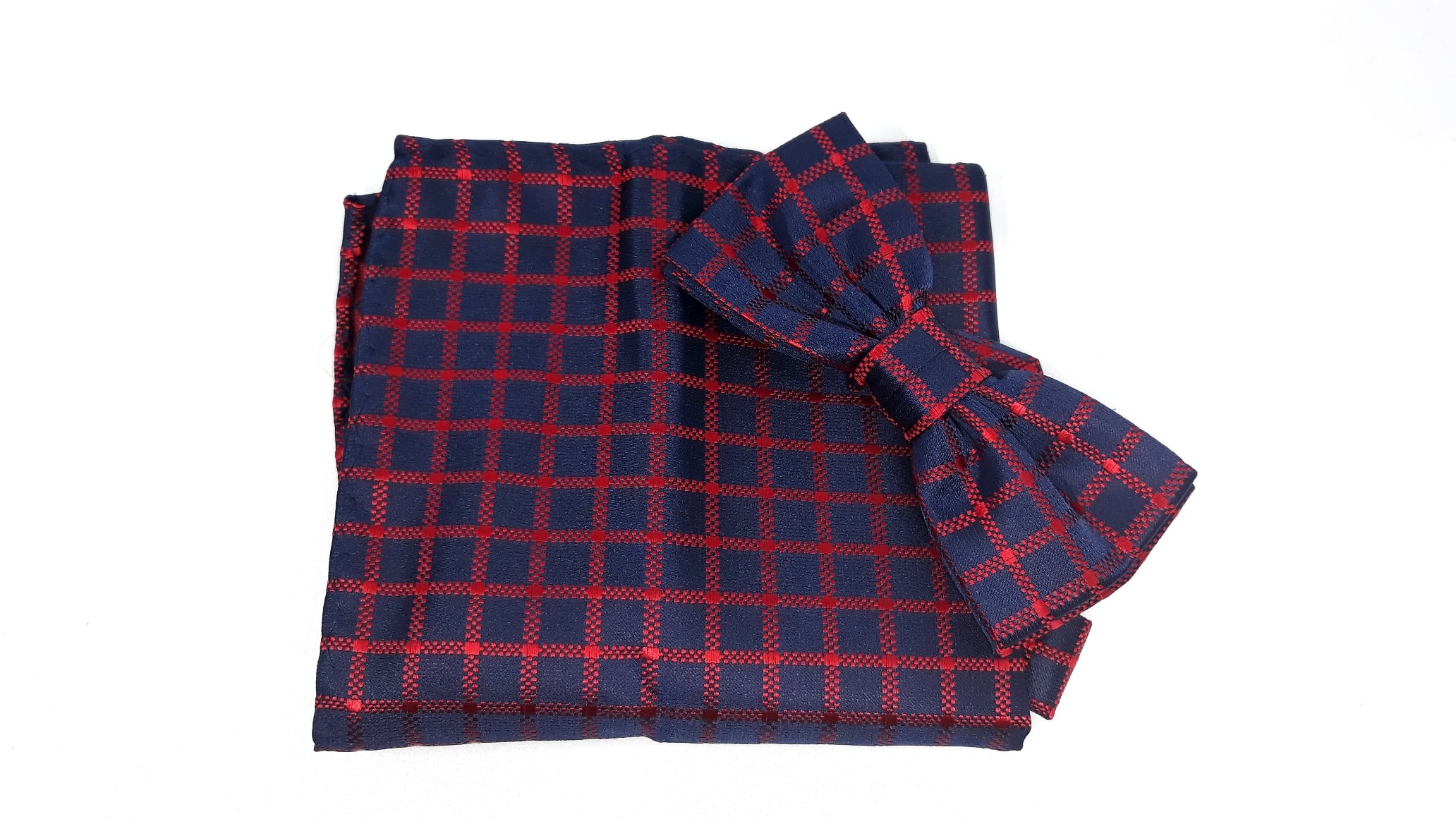 Unikatowa mucha w zestawie z poszetką, czerwona krata na granatowym tle.