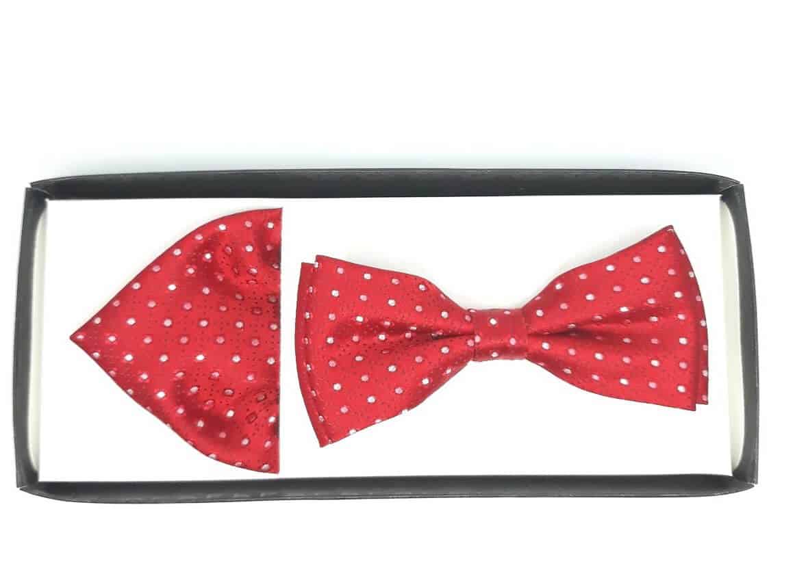 Unikatowa mucha w zestawie z poszetką czerwona w kropki.