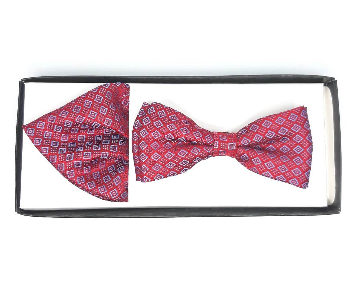 Unikatowa mucha w zestawie z poszetką czerwona w niebieski wzór.