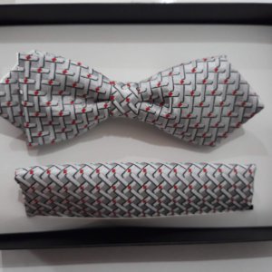 Mucha nie jest ręcznie wiązana lecz zawiązana na stałe. Pasek od muchy posiada regulację zapięcia. Komplet ten zawiera muchę wraz z poszetką widoczną na zdjęciu.