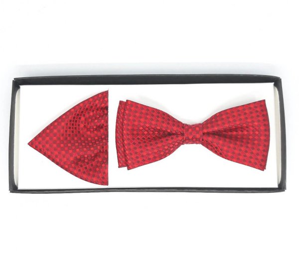 Unikatowa mucha w zestawie z poszetką w kolorze czerwonym w bordowe kwadraty.