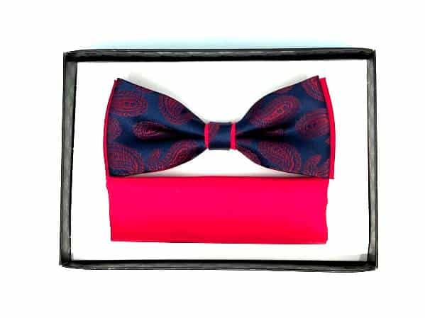 Unikatowa mucha w zestawie z poszetką czerwono granatowa.