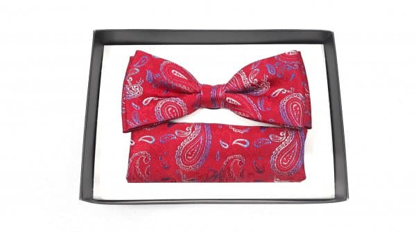 Elegancka mucha w zestawie z poszetką w kolorze czerwonym o unikatowym niebieskim wzorze. Mucha to dodatek, który stanowi bazę garderoby eleganckiego mężczyzny. Zgodnie z płynącym obecnie trendy modowym nie ma obowiązku, który mówiłby o łączenia jej z frakiem czy kołnierzykiem łamanym przy koszuli. Moda nowoczesna zestawia muchę nie tylko ze stylem eleganckim, ale również z luźnym i sportowym strojem. Niebanalna mucha orzeźwi tradycyjny garnitur, jak również wyśmienicie będzie się komponować ze sportową marynarką czy luźnym kardiganem.