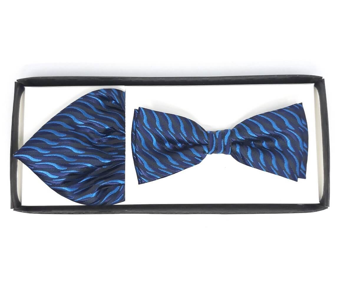 Unikatowa mucha w zestawie z poszetką w kolorze czarno niebiesko granatowym.