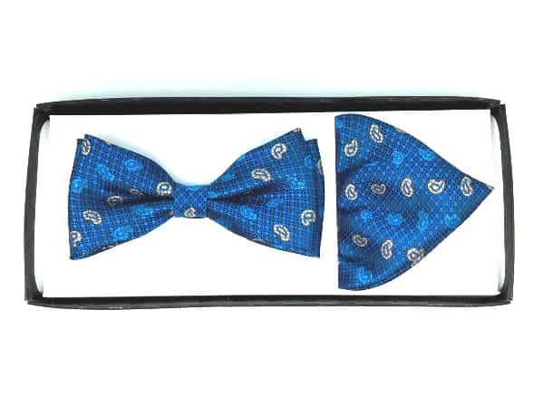 Unikatowa mucha w zestawie z poszetką, granatowa w biało niebieski wzór turecki.