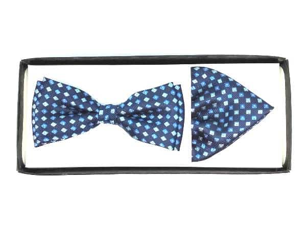 Unikatowa mucha w zestawie z poszetką, granatowa w biało niebieski wzorek.