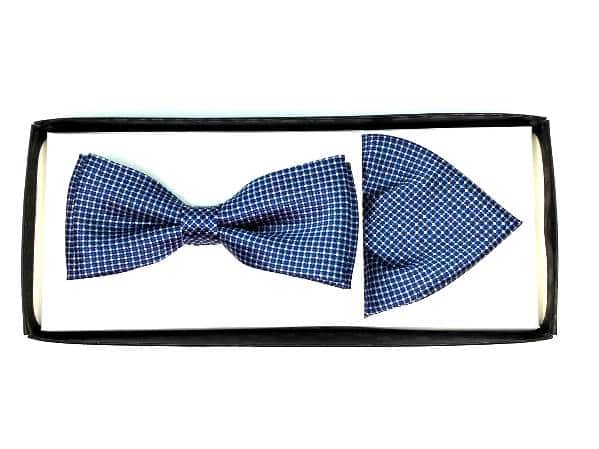 Unikatowa mucha w zestawie z poszetką, granatowa w biały wzorek.