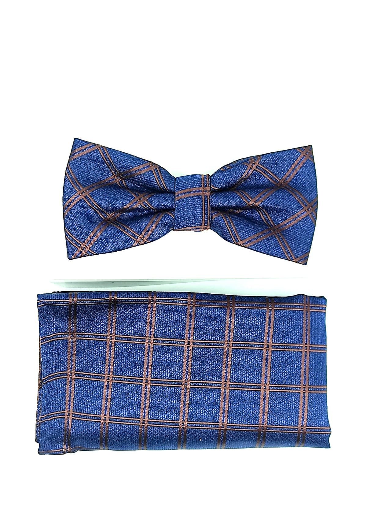 Unikatowa mucha w zestawie z poszetką, granatowa,brązowa krata.