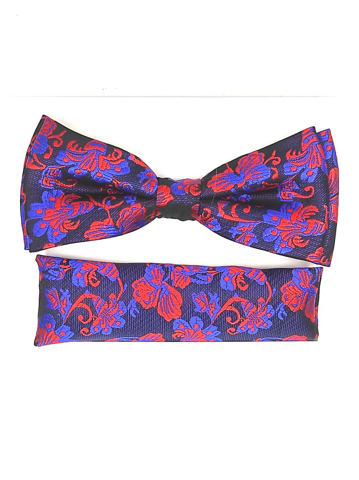 Unikatowa mucha w zestawie z poszetką granatowa w czerwone kwiaty.