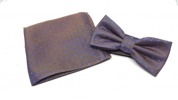 Unikatowa mucha w zestawie z poszetką granatowa w kropki.