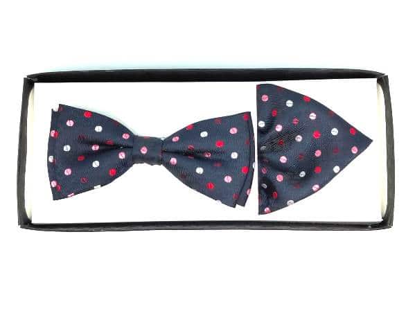 Unikatowa mucha w zestawie z poszetką, granatowa w kolorowe kropki.
