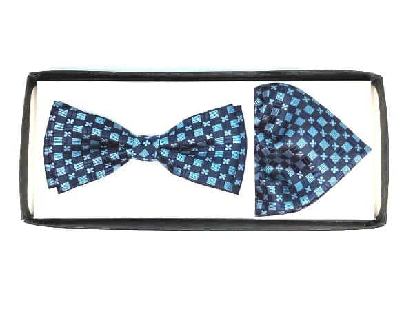 Unikatowa mucha w zestawie z poszetką, granatowa w niebieski wzorek.